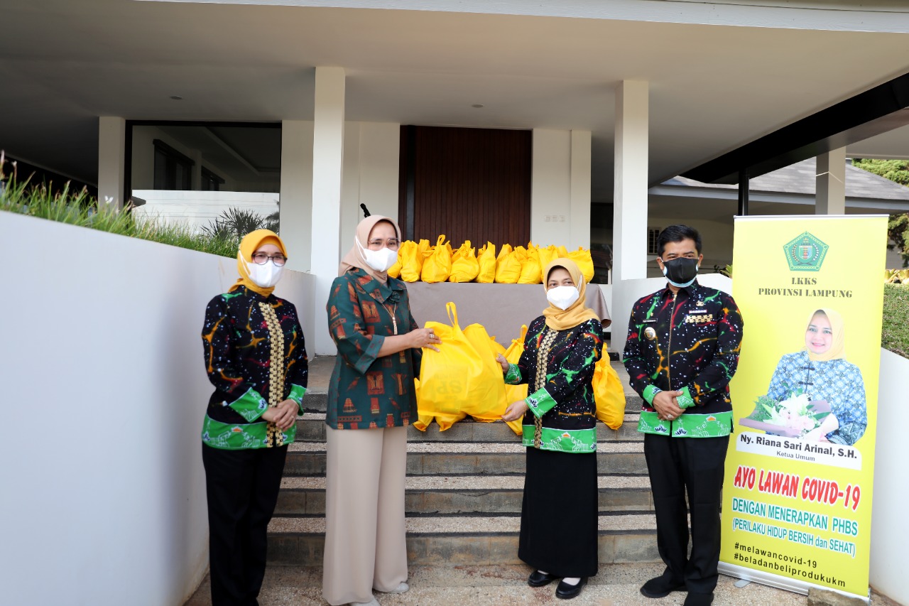 BANDARLAMPUNG, RATUMEDIA.ID   —   Ketua Lembaga Koordinasi Kesejahteraan Sosial (LKKS) Provinsi Lampung Ibu Riana Sari Arinal menyerahkan 150 paket bantuan sembako kepada masyarakat lanjut usia di Kabupaten Pringsewu dan Tulang Bawang secara simbolis, di Mahan Agung, Bandarlampung, Jum’at (23/7/2021).