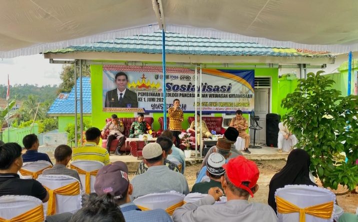 WAY KANAN- Anggota DPRD Lampung, Yusee Sogoran, menyosialisasikan Pembinaan Ideologi Pancasila dan Wawasan Kebangsaan di Kampung Banjar Masin, Kecamatan Baradatu, Way Kanan, Senin (16/6/2025).
