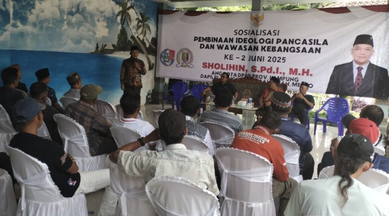 PESAWARAN- Anggota DPRD Lampung, Solihin, menyosialisasikan Pembinaan Ideologi Pancasila dan Wawasan Kebangsaan di Desa Pejambon, Kecamatan Negeri Katon, Kabupaten Pesawaran, Ahad (22/6/2025).
