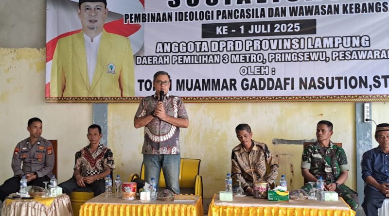 PRINGSEWU- Anggota DPRD Lampung, Tondi Muammar Gaddafi Nasution,  menyosialisasikan Pembinaan Ideologi Pancasila dan Wawasan Kebangsaan di Pekon Sukamulya, Kecamatan Banyumas, Kabupaten Pringsewu, Sabtu (5/7/2025).