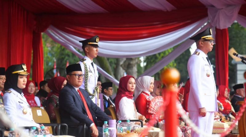 BANDARLAMPUNG- Ketua DPRD Lampung Ahmad Giri Akbar, mengikuti upacara peringatan Hari Ulang Tahun (HUT) ke-80 Kemerdekaan Republik Indonesia di Lapangan Korpri Komplek Kantor Gubernur, Minggu (17/8/2025).