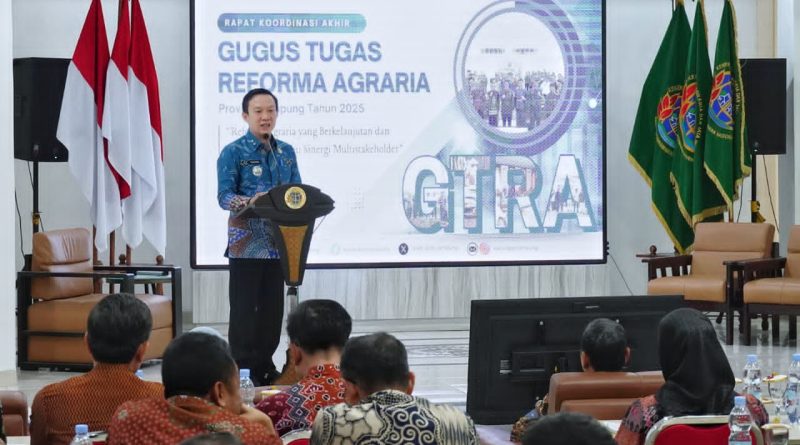 BANDARLAMPUNG, RATUMEDIA.ID- Gubernur Lampung, Rahmat Mirzani Djausal diwakili oleh Sekretaris Daerah Provinsi Lampung, Marindo Kurniawan, membuka secara resmi  Rapat Koordinasi Akhir, Penyelenggaraan Gugus Tugas Reforma Agraria (GTRA) Tahun 2025, dengan tema “Reforma Agraria yang Berkelanjutan dan Berdampak melalui Sinergi Multistakeholder,” di Aula Kantor BPN Provinsi Lampung, Kamis (18/9/2025).
