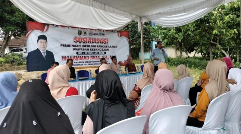 PESAWARAN, RATUMEDIA.ID —- Anggota DPRD Lampung, Mohammad Reza Berawi, menyosialisasikan Pembinaan Ideologi Pancasila dan Wawasan Kebangsaan di Desa Sukaraja, Kecamatan Gedung Tataan, Kabupaten Pesawaran, Sabtu (07/02/2026).