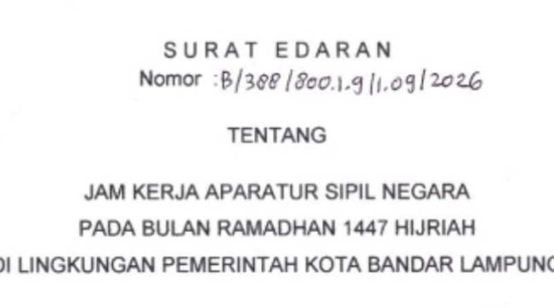 BANDARLAMPUNG, RATUMEDIA.ID- Walikota Bandarlampung, Eva Dwiana, menerbitkan surat edaran (SE) tentang jam kerja Aparatur Sipil Negara (ASN) selama Ramadan 1447 Hijriah di lingkungan Pemerintah Kota Bandarlampung.